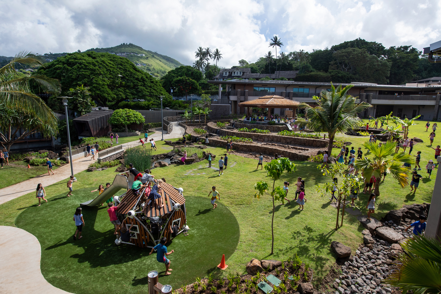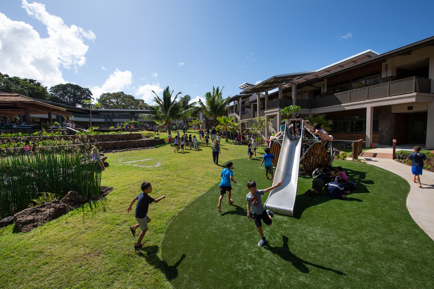 Kosasa Community is alive with running, laughing, climbing, exploring children. In the same way that the indoor environments are designed to facilitate as many types of learning experiences as possible, the diverse outdoor environments run the gamut from open, grassy lawns for running freely, to quiet corners for reflection, to the adventure of exploring a native forest environment or the adrenaline of kinetic play structures.