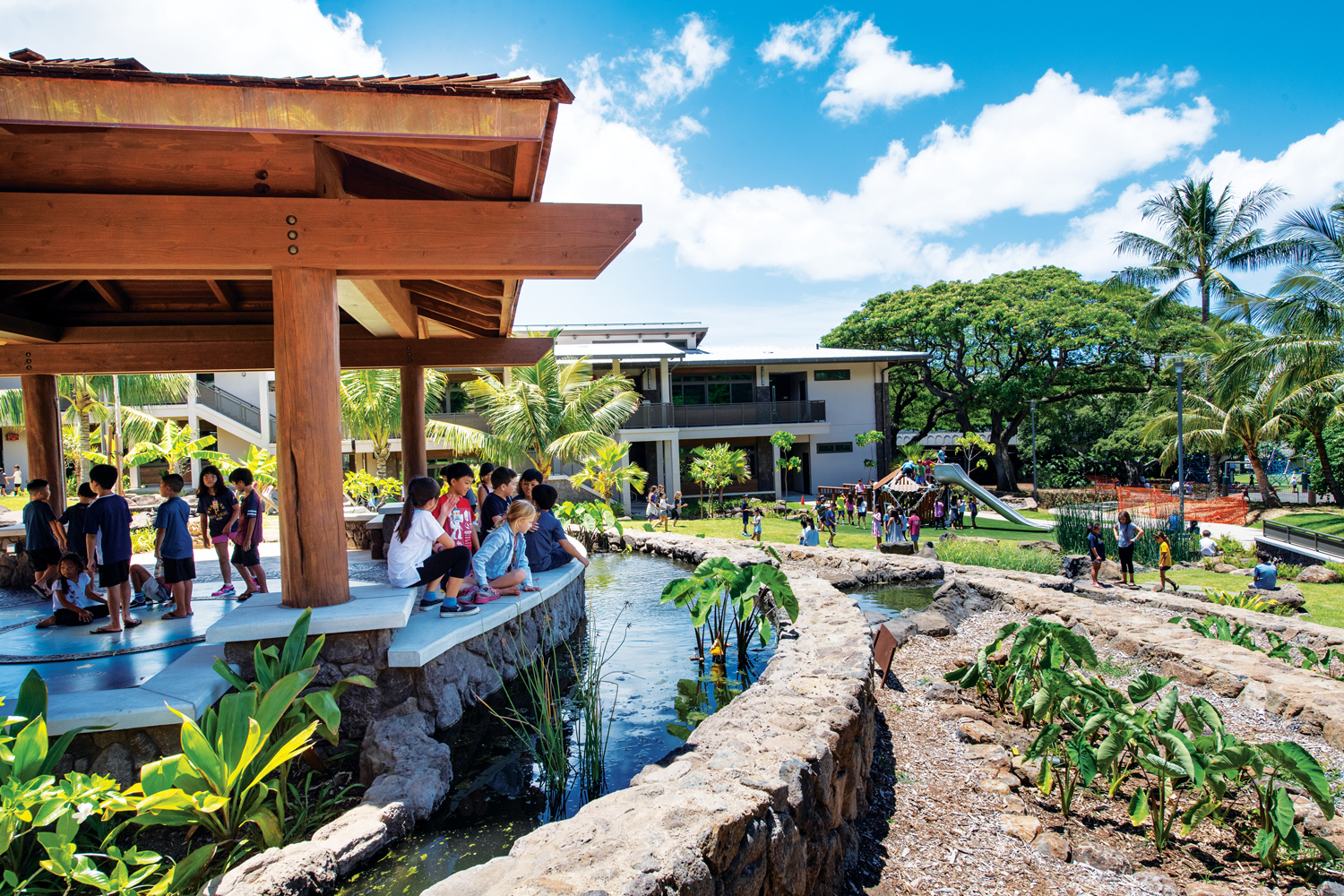 JAMES K. SCOTT ’70 PLAYGROUND Reaffirming Punahou’s connection to its historical, geographical and spiritual center – the fresh waters of Ka Punahou – was a hallmark of Jim Scott’s tenure. The Kosasa Community celebrates that connection in a tangible way through its thoughtful incorporation of the New Spring into the design of its outdoor environments. This playground for grades 2 – 3 will always ring with the sound of children’s laughter as they grow and learn near this symbol of the School’s renewal.